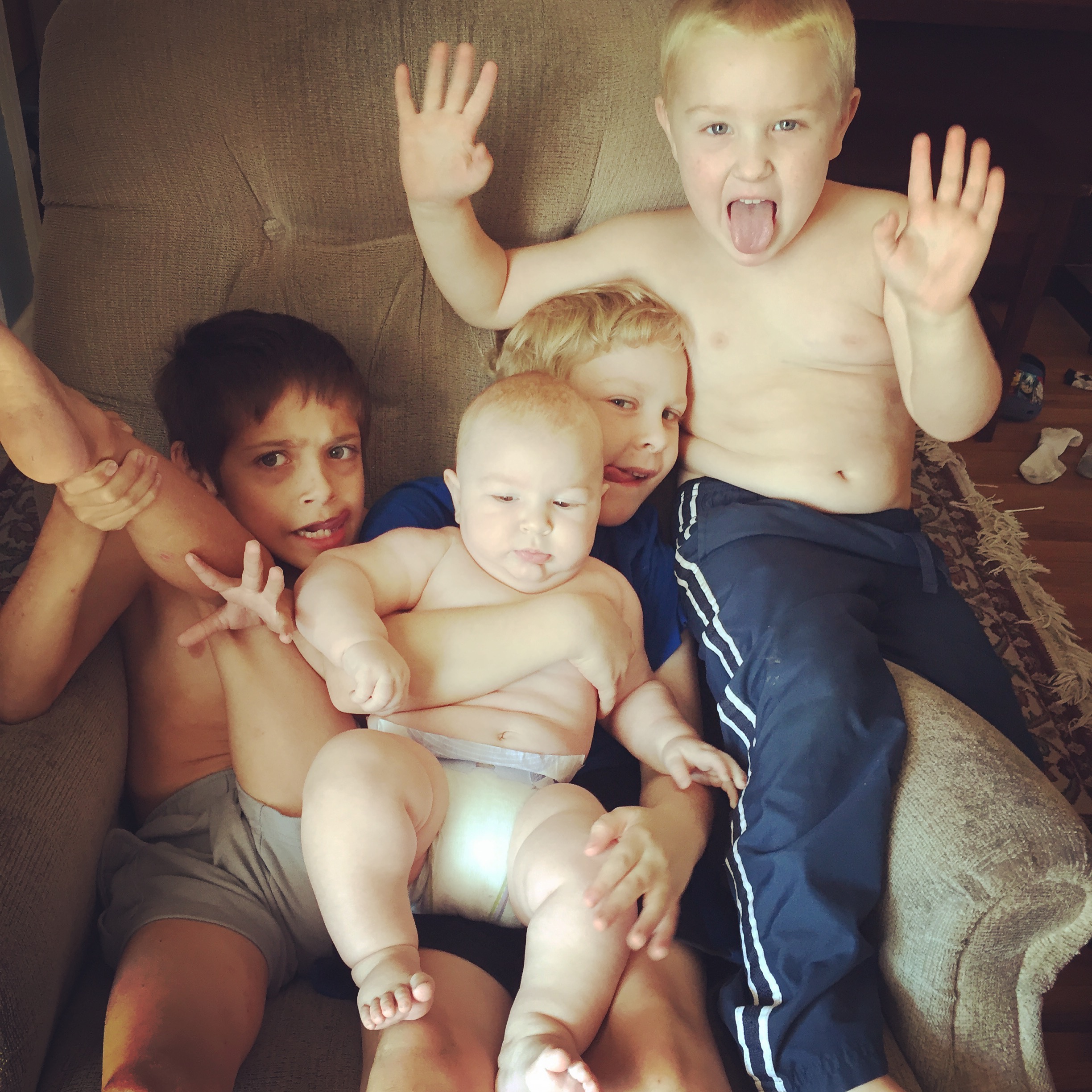 Time to burp the baby.  He just threw up on me again.  Where is my second cleanest shirt?  “Boys, the baby is happy on the floor.  Don’t touch him!”  Back to the makeup.  Halfway through the mascara the baby is crying.  I look out in the living room and see that all 3 of the big boys have surrounded the baby and are taking turns poking him (they say they are tickling him).  “Get back in the kitchen and eat your goldfish!”  I attempt to hold the baby and complete my ‘day look’ while the boys are in the kitchen.